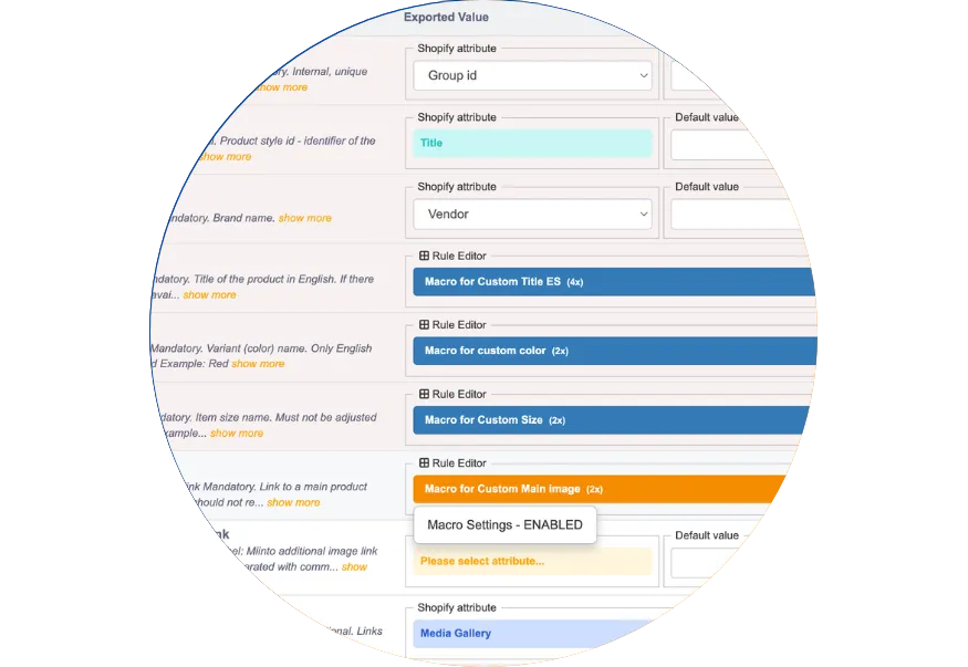 U kunt de productattributen van uw winkel koppelen aan de vereiste velden van elk kanaal, met ondersteuning voor standaardwaarden en veldprioriteiten.