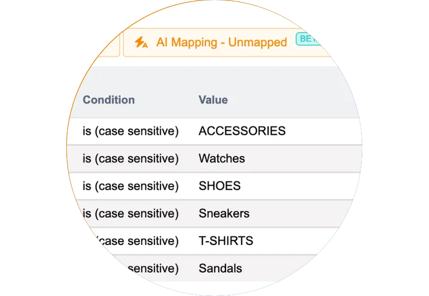 • AI-gestuurde mapping koppelt uw winkelcategorieën aan de meest relevante marktplaatscategorieën.